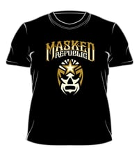 The Masked Republic Logo tee is back in this limited run color scheme! Tan and white on a black 100% cotton tee.