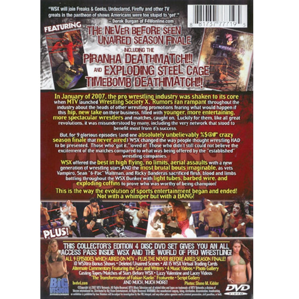 Every moment of Wrestling Society X ever released - and then some! All 10 episodes including the unaired season finale with the exploding time bomb cage match (Team Dragon Gate vs. Matt Cross & Teddy Hart) and the Piraña Deathmatch (The Cartel - Lil' Cholo & Delikado (B-Boy) vs. Los Pochos Guapos - Kaos & Aguilera), all 10 WSXtra episodes, deleted scenes, photo gallery, SCRIPT GALLERY and more.